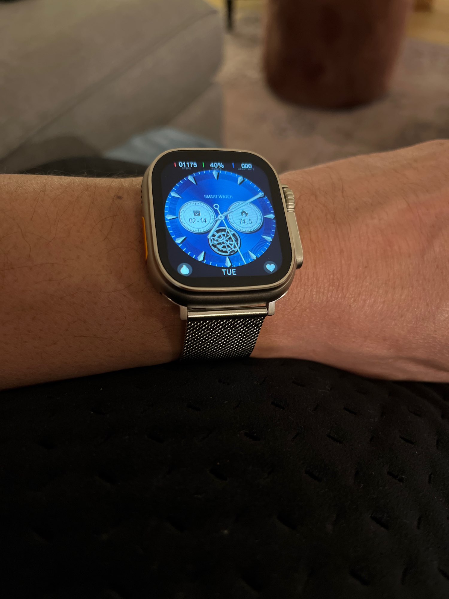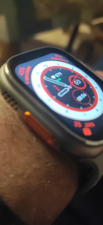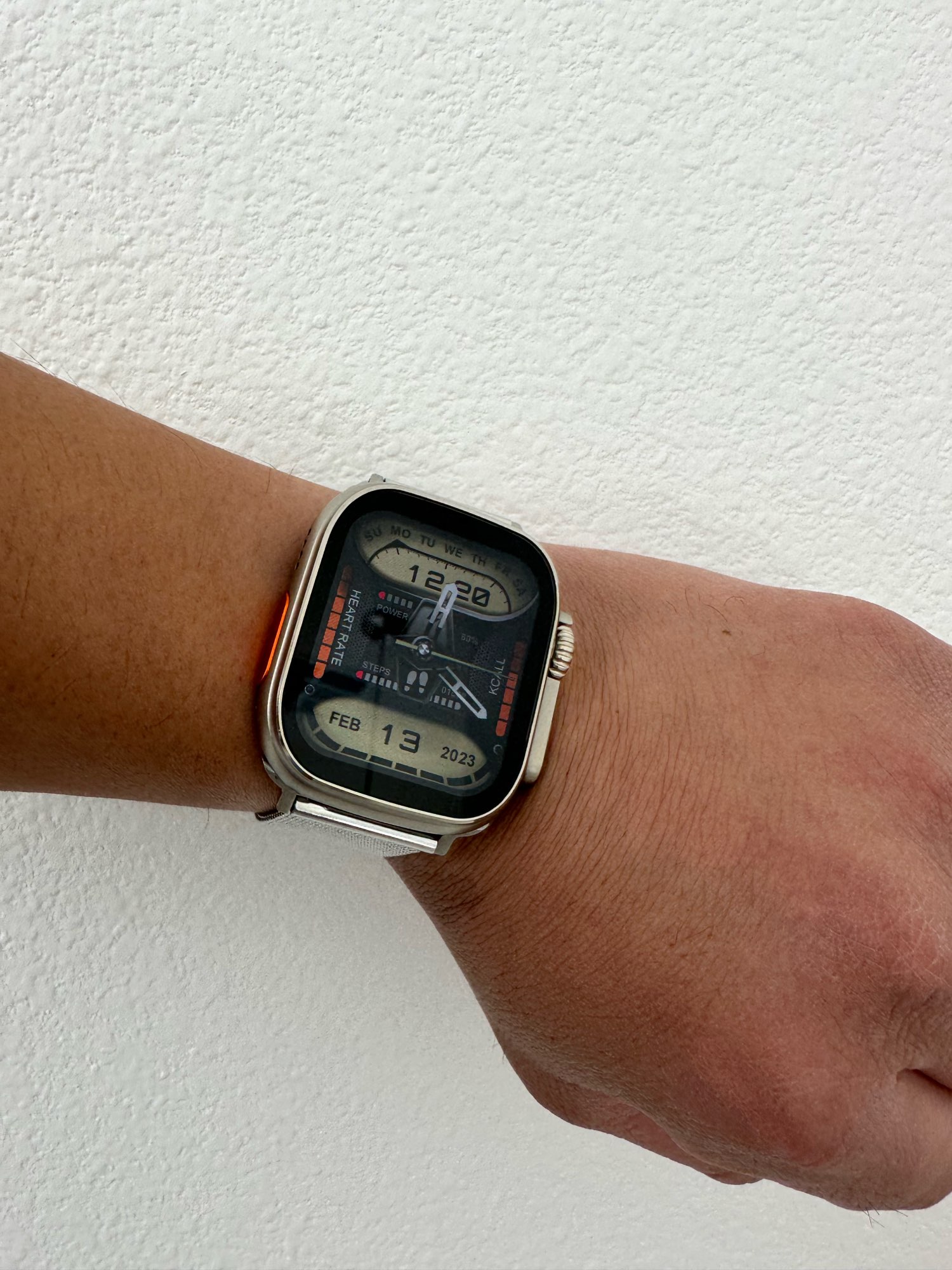 The watch Ultra has a bigger and brighter screen. A stunning display with 2000 nits of peak brightness, twice as bright as any other watch,is legible in direct sunlight. There is also a larger screen space,which can present a number of health indicators and rich dial details.